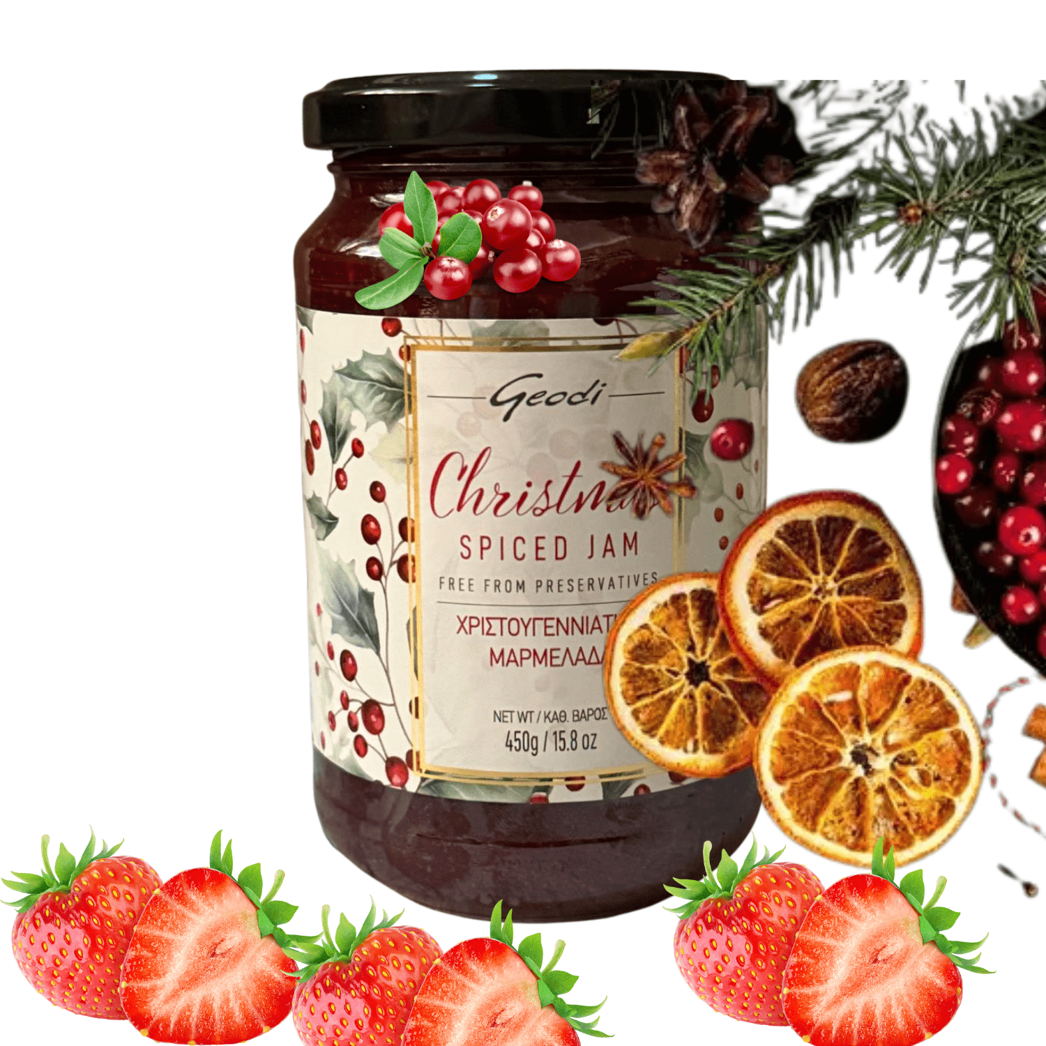 Ingrediente: zahăr, căpșuni, merișor, suc de portocale, condimente. Produs cu 55 g fruct la 200 g. Valori nutritionale/100g: energie 1054 kj/252 kcal, grăsimi <0,5 g din care saturate 0 g, carbohidrațí 62 g, din care zaharuri 60 g, proteine 0,2 g, sare 0,1 g. Greutate netă 450 g. Produs in Grecia de Geodi S.A.